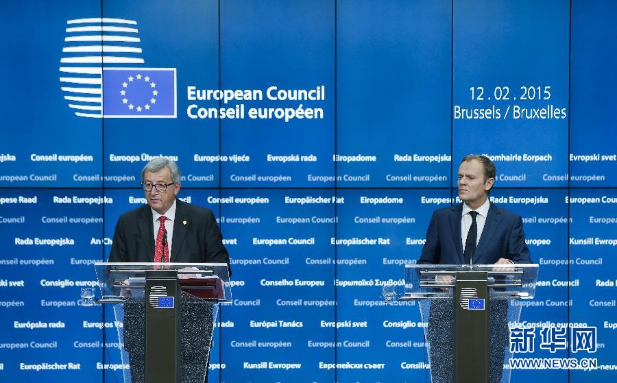 2月12日,在比利时首都布鲁塞尔,欧盟委员会主席容克(左)与欧洲理事会主席图斯克在欧盟峰会结束后出席新闻发布会。欧盟当日举行特别峰会,讨论乌克兰危机、希腊债务及反恐等议题,希腊债务问题成为会议焦点。 新华社记者周磊摄