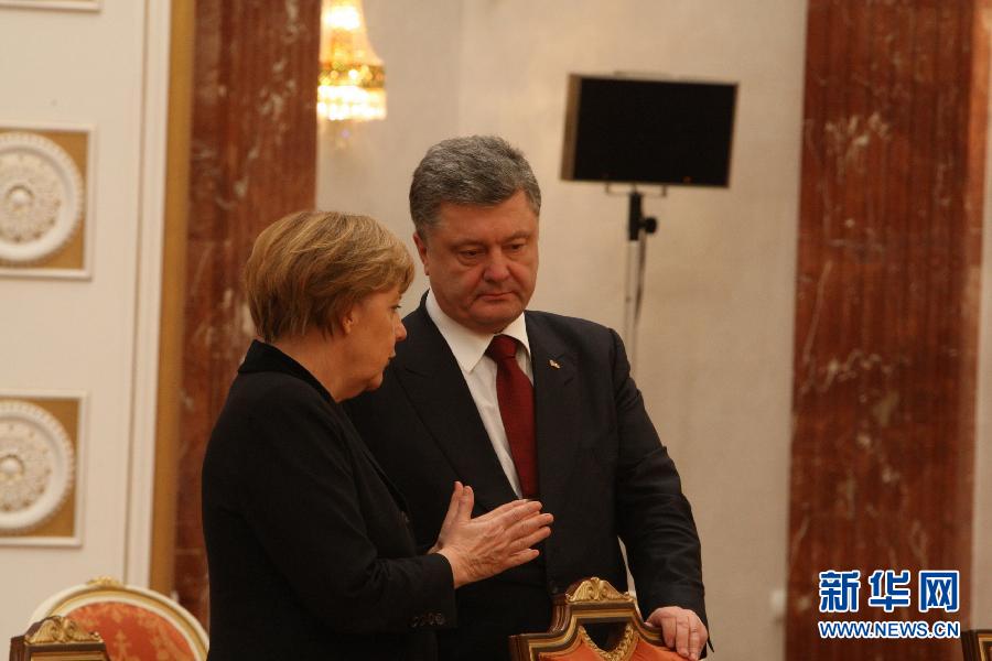 2月11日,在白俄罗斯首都明斯克,乌克兰总统波罗申科(右)和德国总理默克尔交谈。新华社发(根纳季摄)