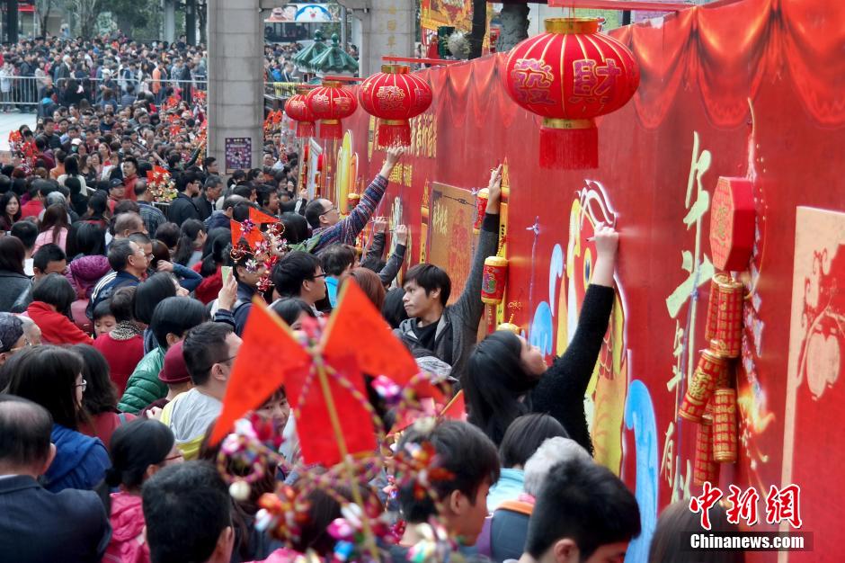 2月19日,大年初一,香港黄大仙祠香客云集,亦有众多市民在祈愿墙上写下新年愿望。黄大仙祠是香港最著名的庙宇之一,享负盛名。每年农历年底及正月初一至十五,都有大量善信前往该祠,为过去一年酬谢神恩及为未来一年求神庇佑。中新社发 张宇 摄