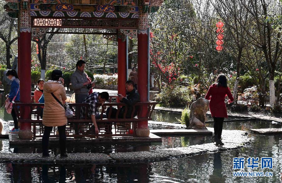 2月23日,人们在黑龙潭风景区休闲。新春佳节期间,云南省昆明市官渡区滇源镇黑龙潭风景区数千株茶花争奇斗艳,人们纷纷利用春节长假,前来观赏拍照,休闲度假。 新华社记者杨宗友摄