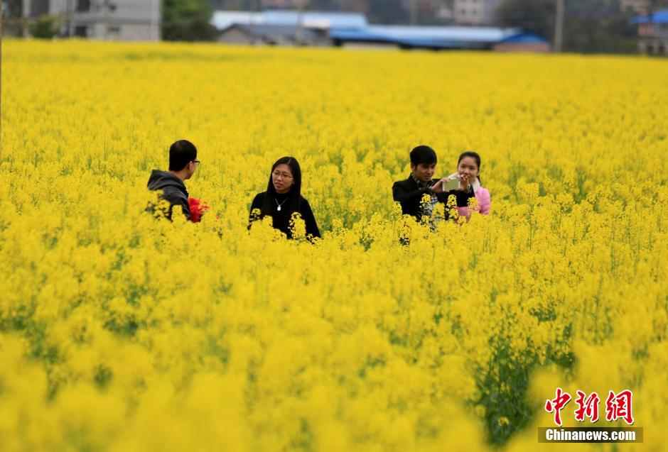 图为2月24日,在广西柳州市融安县长安镇白马坡村,游客在油菜花地里踏青赏花。黄国良 摄