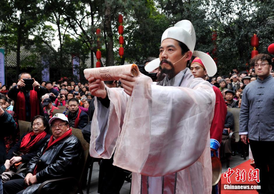 2月25日是农历正月初七,成都杜甫草堂举办乙未年“人日游草堂”祭拜诗圣杜甫活动。庄严肃立的祭祀队伍在盛装仪仗的引领下缓缓步入祭祀主会场。在行过净手之后,主祭人神情肃穆,仪态庄重分别完成了奠帛、诵读祭文等环节,童声诵读的祭文,余音袅袅,犹如天籁,沁人心脾,各界民众在司仪的唱礼声中向诗人塑像三鞠躬,以表达对诗圣杜甫的深深敬意。安源 摄