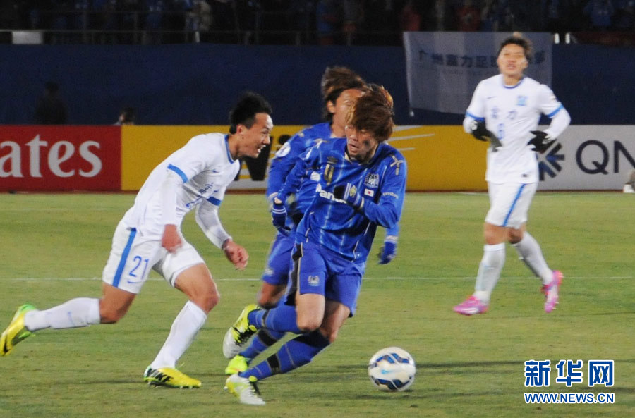 2月24日,广州富力队球员常飞亚(左)在比赛中拼抢。当日,在日本大阪举行的2015亚洲足球冠军联赛小组赛F组的一场比赛中,中国广州富力队客场以2比0战胜日本大阪钢巴队。新华社记者马兴华摄