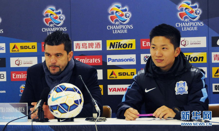 2月24日,广州富力队主教练孔特拉(左)在赛后新闻发布会上。当日,在日本大阪举行的2015亚洲足球冠军联赛小组赛F组的一场比赛中,中国广州富力队客场以2比0战胜日本大阪钢巴队。新华社记者马兴华摄