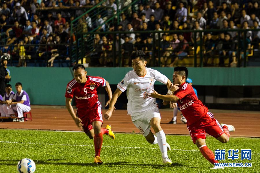 2月24日,山东鲁能队球员郑铮(中)在比赛中拼抢。当日,在越南平阳省土龙木市举行的2015亚洲足球冠军联赛小组赛中,中国山东鲁能队以3比2战胜越南平阳工业队。 新华社发(阮黎暄摄)