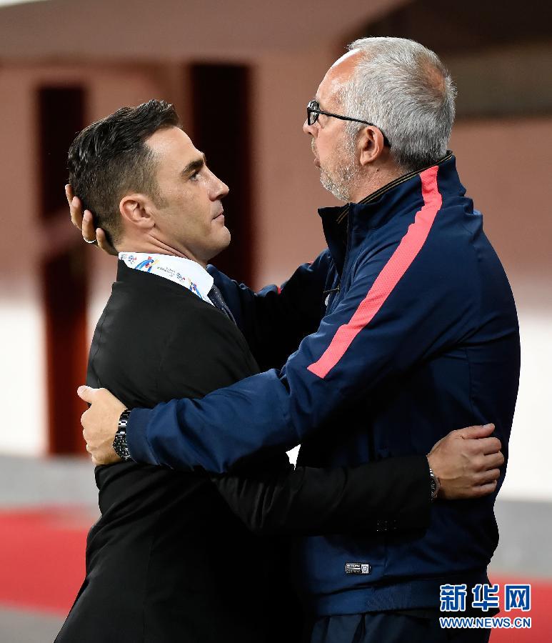 2月25日,广州恒大队执行主教练卡纳瓦罗(左)赛后和教练团成员庆祝。当日,在2015年亚洲足球冠军联赛H组首轮比赛中,中超联赛广州恒大队主场以1比0战胜韩国联赛首尔FC队。 新华社记者刘大伟摄