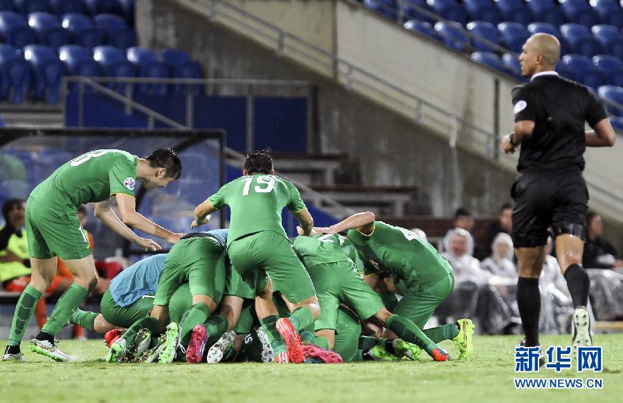2月25日,北京国安队球员们庆祝球队得分。当日,在澳大利亚黄金海岸洛宾纳体育场举行的2015亚洲足球冠军联赛G组第一轮比赛中,中超北京国安队以1比0战胜澳超布里斯班狮吼队。新华社记者金林鹏摄