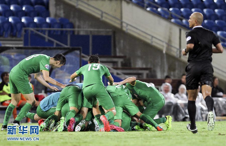 2月25日,北京国安队球员们庆祝球队得分。当日,在澳大利亚黄金海岸洛宾纳体育场举行的2015亚洲足球冠军联赛G组第一轮比赛中,中超北京国安队以1比0战胜澳超布里斯班狮吼队。新华社记者 金林鹏 摄 图片来源:新华网
