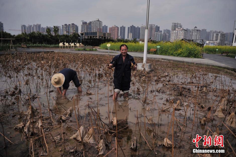 2月25日,重庆一公司楼顶“开心农场”油菜花已盛开。据该公司负责人介绍,在楼顶建设“开心农场”主要是为了给员工提供一个休闲舒适的休息环境,来释放工作带来的各种压力。同时,自己种植的蔬菜也可自行采摘回家。图为员工们正在淤泥里挖藕。中新社发 陈超 摄