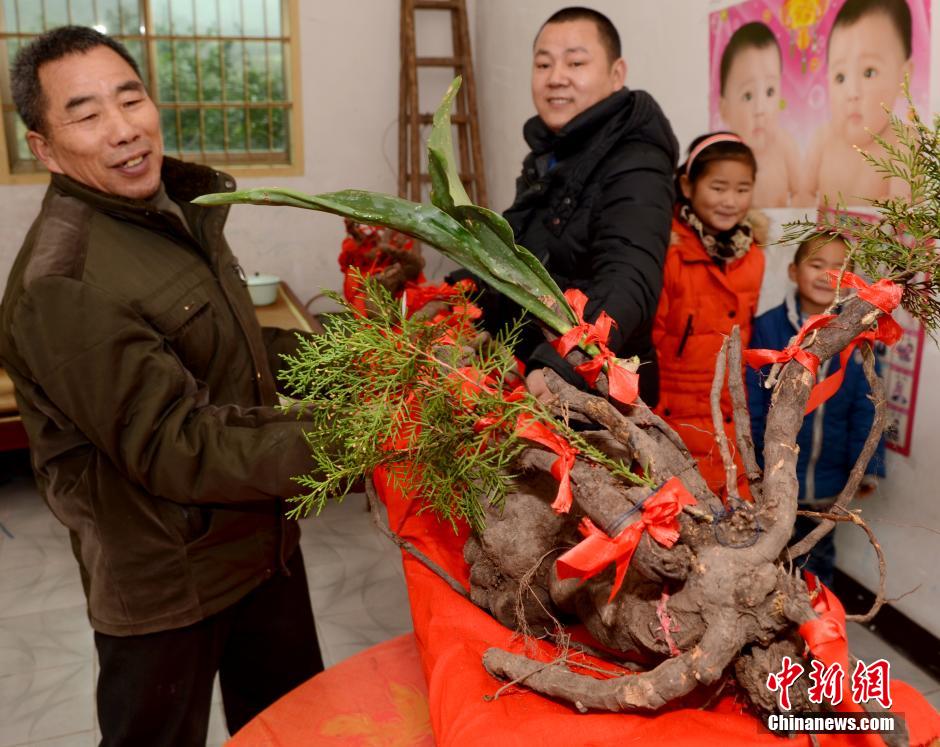2月25日,在浙江省金东区源东乡山下施村施贤贵家中,一株重达23斤,长达3.3米的疑似何首乌的根状物,吸引了不少村民围观。该根状物形似神话中的龙,施贤贵用红布条绑上万年青、柏树枝等加以装饰,以增添新年喜气。据悉,该根状物是施贤贵两天前在村边一山上的悬崖边发现,为保持根须完整,他和儿子徒手花了两天时间将其挖出。中新社发 邵勤旦 摄