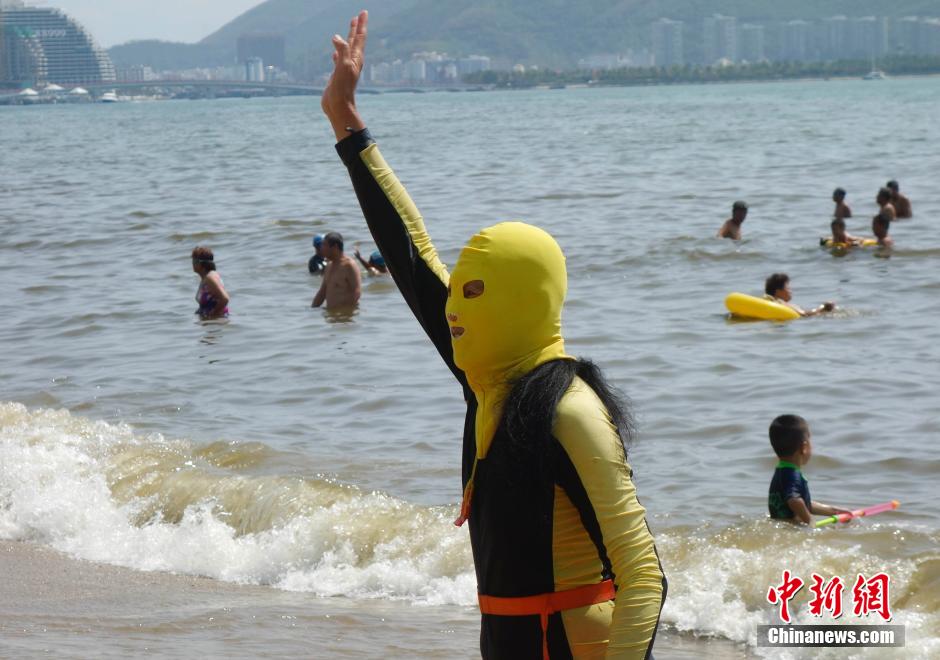 2月25日,不少在三亚海滩游泳的游客“全副武装”戴蒙面头套防晒伤,这个面具在网络上被称为“脸基尼”。中新社发 杜洋 摄