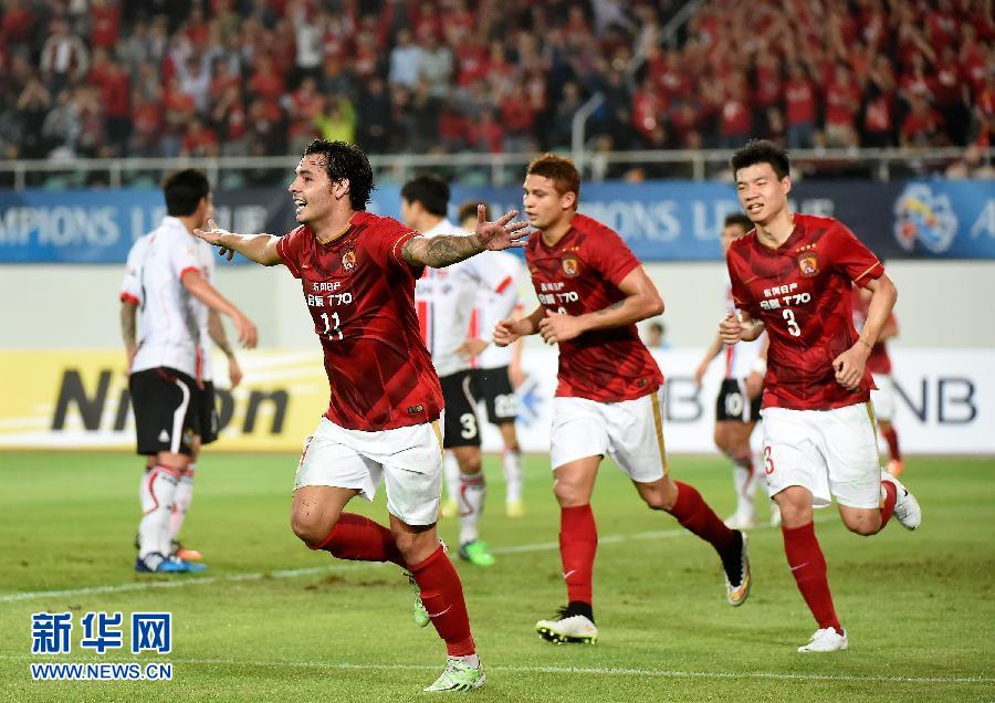 2月25日,广州恒大队球员高拉特(左二)庆祝进球。当日,在2015年亚洲足球冠军联赛H组首轮比赛中,中超联赛广州恒大队主场对阵韩国联赛首尔FC队。 新华社记者刘大伟摄