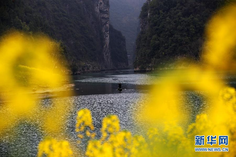 早春时节,重庆市阿蓬江峡谷油菜花开,香飘水面。 新华社发(杨敏 摄)