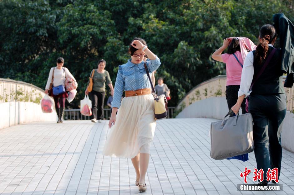 2月27日,春节期间的南宁迎来了30℃的高温天气。2月尚未结束,南宁就提早“火”了起来。据介绍,南宁本月已有连续5天平均气温超22℃,按气候学标准,南宁已入夏。图为人行天桥上遮衣挡阳的行人。中新社发 宋汉涛 摄