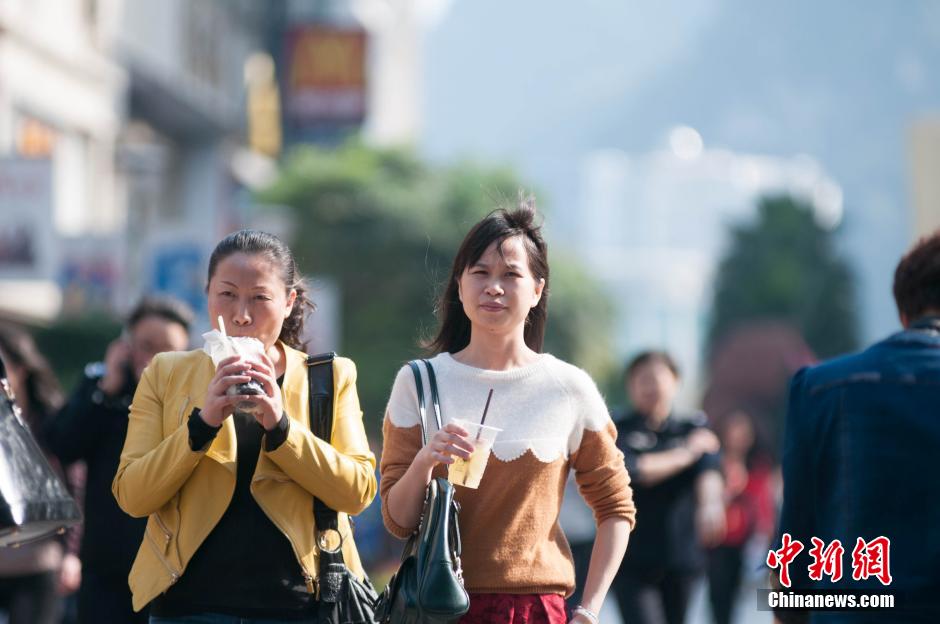 2月27日,广西柳州市街头,气温飙升使很多市民身着夏装短裙,冷饮成了畅销品。当日,广西大部分地区艳阳高照,气温飙升至28℃以上,在南宁、百色、崇左等地,最高气温超过30℃。据南宁城区凤岭气象观测站记录显示,2015年春节黄金周期间,南宁平均气温达21.3℃,较历年同期偏高6.3℃,偏高程度为南宁有气象记录以来的最大值,成为南宁61年气象史上最热的春节。 黄威铭 摄