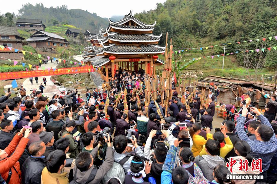 2月27日,广西三江侗族自治县老堡乡白文村古这屯风雨桥落成,当地侗族同胞以祭桥、多耶、百家宴、芦笙踩堂及传统纺织技艺展示等形式庆祝。该桥始建于2014年6月,桥长39米。侗族风雨桥亦称福桥或花桥,是侗族人民标志风物,集桥、廊、亭三者为一体,是侗族桥梁建筑艺术的结晶。广西三江素有“世界楼桥之乡”美誉,全县境内现存风雨桥120余座。图为风雨桥落成庆典现场。 吴练勋 摄