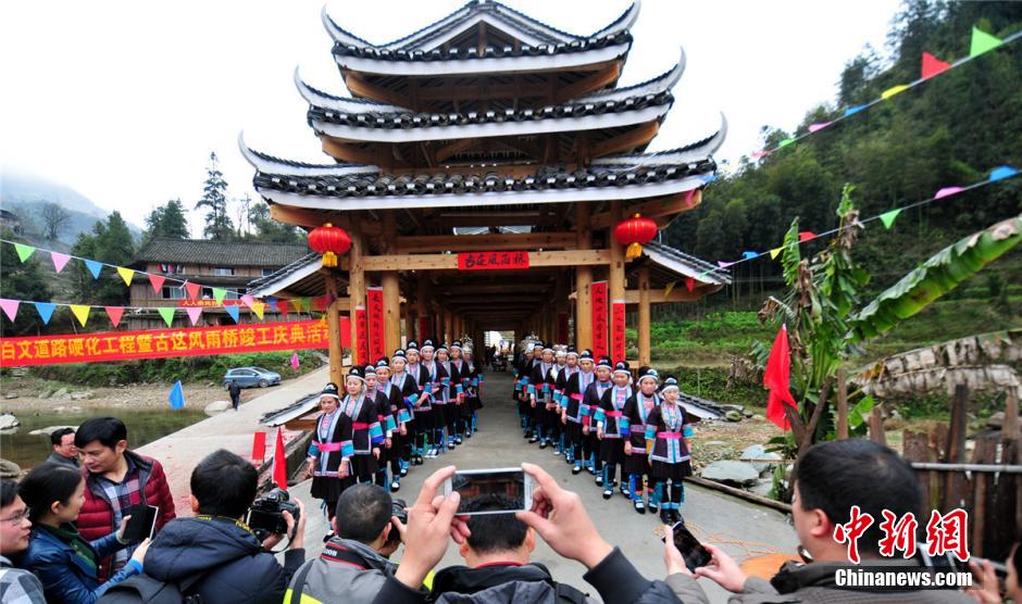 2月27日,广西三江侗族自治县老堡乡白文村古这屯风雨桥落成,当地侗族同胞以祭桥、多耶、百家宴、芦笙踩堂及传统纺织技艺展示等形式庆祝。图为风雨桥落成庆典现场,群众在迎接宾客。 龚普康 摄