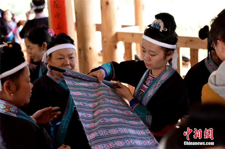 2月27日,广西三江侗族自治县老堡乡白文村古这屯风雨桥落成,当地侗族同胞以祭桥、多耶、百家宴、芦笙踩堂及传统纺织技艺展示等形式庆祝。图为风雨桥落成庆典现场,妇女在圈侗锦。 吴练勋 摄