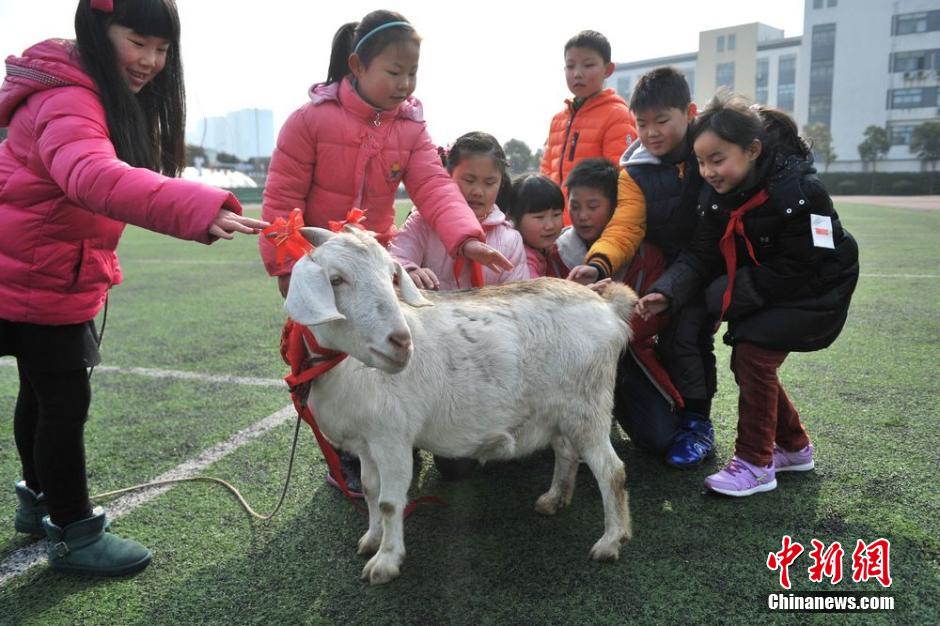 3月1日,苏州市善耕实验小学校小农场里饲养的两只山羊“吉吉”和“祥祥”头戴红花,以可爱呆萌形象出现在校园内,吸引了不少前来报到的学生,或驻足观赏,或上前合影,还有的甚至牵着山羊,在操场上欢快奔跑,以此迎接新学期的到来。王思哲 摄