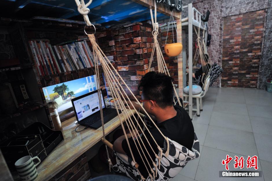 3月2日,云南大学滇池学院杨林校区旅游管理专业大二的4名学生,自己花了300多元钱,把宿舍打造成了滇池学院的“最文艺宿舍”,获得了学校的肯定和同学们的好评。图为学生自己在网络上买了墙纸和吊椅“装修”宿舍。中新社发 任东 摄