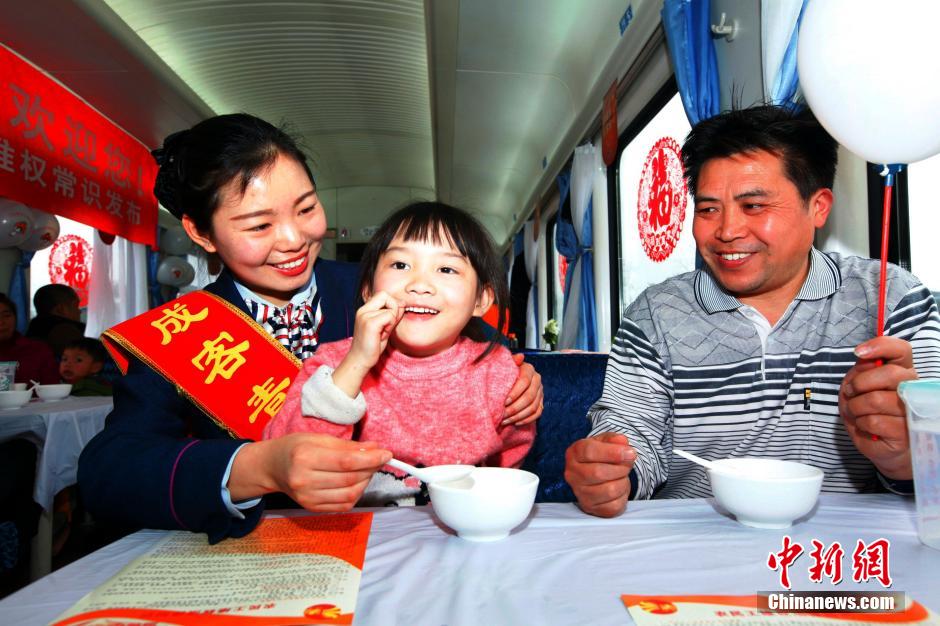 3月3日上午8时,成都铁路局成都客运段联合广东省总工会、广州市总工会、广州市人力资源市场在成都开往广州东的K4075次增开列车上,开展以“幸福暖冬立新功,‘三个出行’当先锋”为主题的专场“招聘会”,为外出务工人员免费提供广州市近期各人力资源市场招聘会信息、维权法律知识读本、发放“求职防骗小知识”宣传资料以及饮用水杯等。同时,还专门在列车办公席设立劳动保障咨询点,现场为外出务工人员答疑解惑,受到了外出务工人员的广泛好评。胡志强 摄
