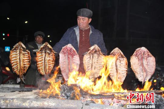 买买提·买克苏木是烤鱼世家,他每晚经营烤鱼,鱼来自当地红海水库,每条鱼在3公斤左右,用木火烤制,洒少许调料,香酥可口。每晚可卖出50条鱼,夏天最多时卖出80条。 朱景朝 摄