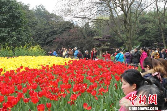 图为重庆花卉园郁金香绽放,吸引众多市民前来参观。 周毅 摄
