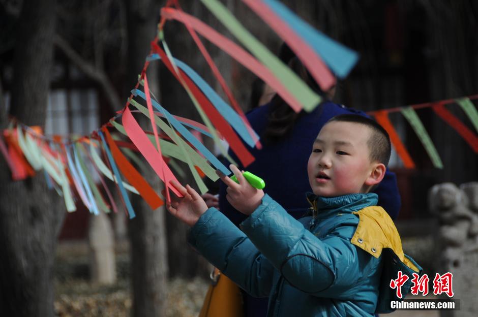 3月4日,山西太原文庙,写在彩带上的6000多条涵盖历史、生活常识等方面的灯谜,吸引众多民众前来猜谜闹元宵。 武俊杰 摄