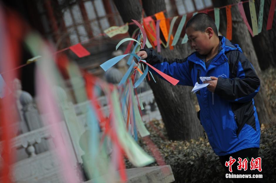 3月4日,山西太原文庙,写在彩带上的6000多条涵盖历史、生活常识等方面的灯谜,吸引众多民众前来猜谜闹元宵。 武俊杰 摄