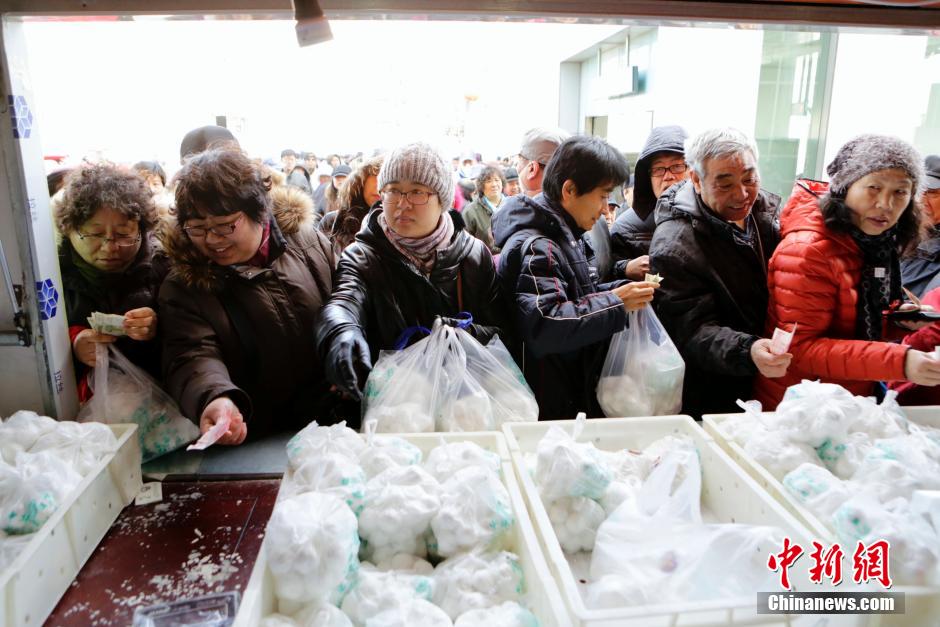 3月4日,随着元宵节临近,北京老字号小吃的元宵销售火爆,市民大排长龙等待购买,厨师在店里加紧加工包装。中新社发 李慧思 摄