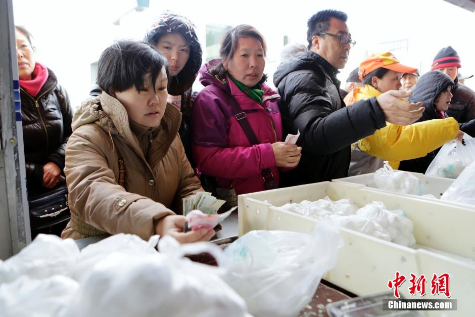 3月4日,随着元宵节临近,北京老字号小吃的元宵销售火爆,市民大排长龙等待购买,厨师在店里加紧加工包装。中新社发 李慧思 摄