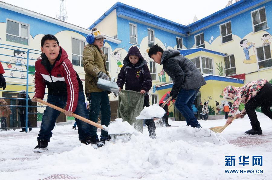 3月4日,在黑龙江省牡丹江市的一所小学,学生在清理操场积雪。当日,牡丹江市出现降雪降温天气,平均气温下降6摄氏度以上,给当地居民出行带来不便。 新华社发(张春祥 摄)