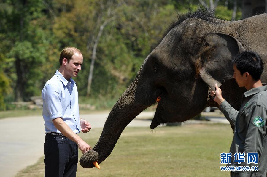3月4日,英国剑桥公爵威廉王子给大象“然然”喂食。当日,英国剑桥公爵威廉王子来到云南省西双版纳傣族自治州探访亚洲象种源繁育基地。 新华社记者胡超摄