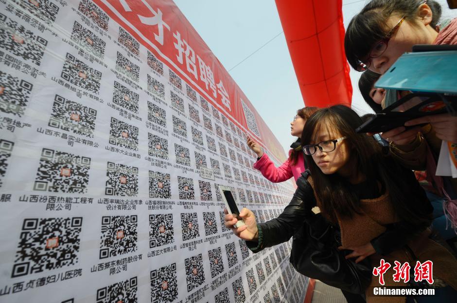 3月6日,山西太原举办大型招聘会,民众使用手机扫描二维码求职。本次招聘会采用互联网技术,求职者只需扫描二维码即可领取电子门票,获取电子会刊,且无需携带纸质简历,用手机点选完成电子简历。所有参展企业均有专属的招聘二维码,求职者使用手机扫描即可直接投递电子简历给企业。 中新社发 韦亮 摄
