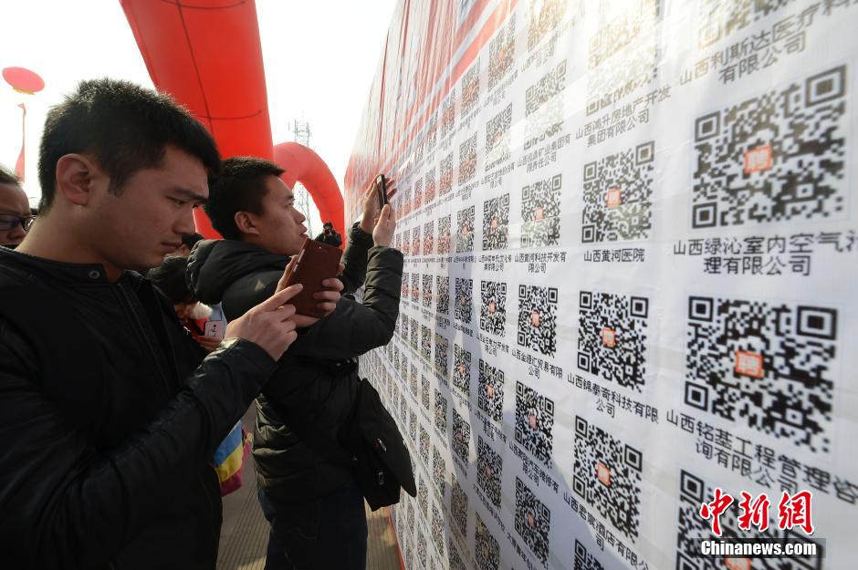 3月6日,山西太原举办大型招聘会,民众使用手机扫描二维码求职。 中新社发 韦亮 摄