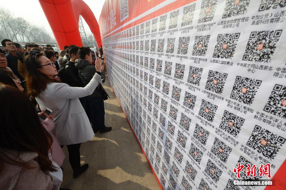 3月6日,山西太原举办大型招聘会,民众使用手机扫描二维码求职。 中新社发 韦亮 摄