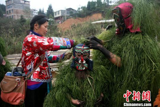 3月7日农历正月十七,是广西融水苗族自治县安陲乡一年一度的芒篙节。图为苗族百姓在装扮“芒篙”。 龚祥友 摄