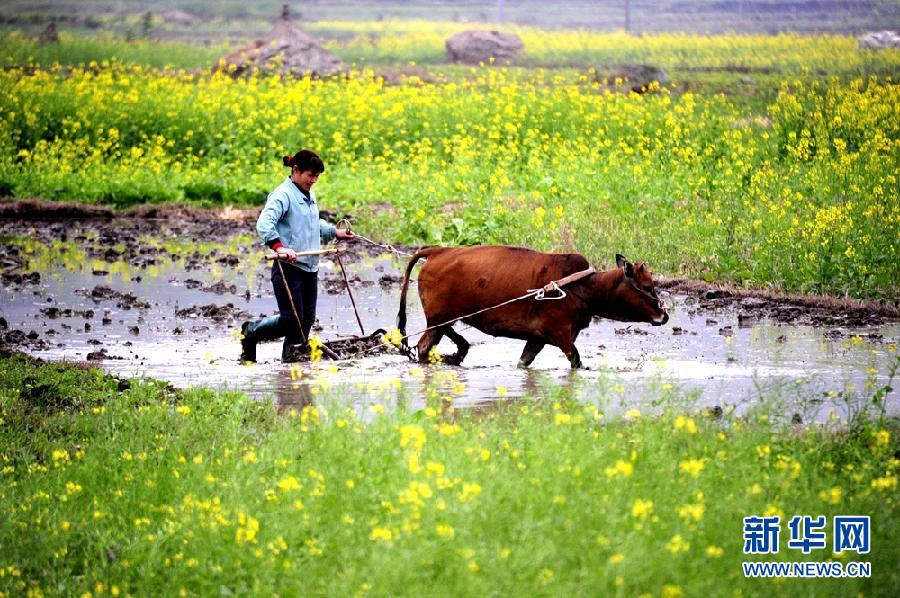 3月7日,在广西罗城县四把镇下里社区,一名农妇在耙田。早春时节,气温逐渐回暖。各地农民抢抓农时全力投入春耕备耕生产,田间地头处处一派繁忙景象。 新华社发(吴耀荣 摄)
