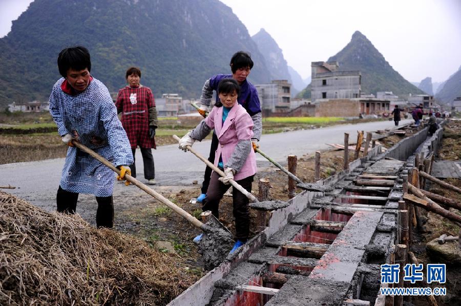 3月7日,广西罗城县四把镇思平村村民在修筑水利渠道,为春耕做准备。早春时节,气温逐渐回暖。各地农民抢抓农时全力投入春耕备耕生产,田间地头处处一派繁忙景象。 新华社发(吴耀荣 摄)
