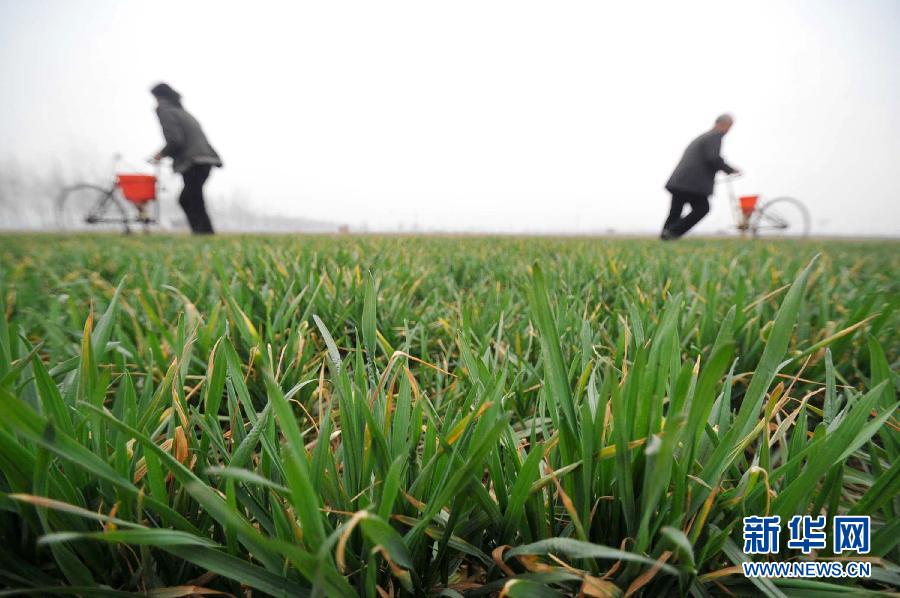 3月7日,山西运城市新绛县泽掌镇小聂村农民在田间为小麦追肥。早春时节,气温逐渐回暖。各地农民抢抓农时全力投入春耕备耕生产,田间地头处处一派繁忙景象。 新华社发(高新生 摄)