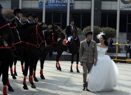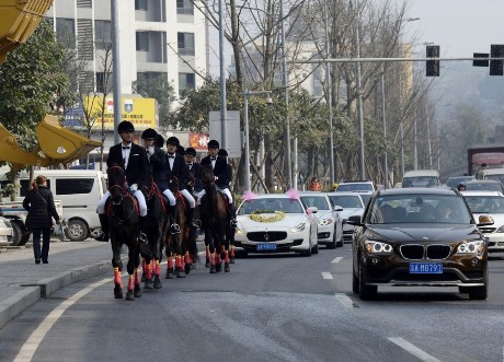 2015年3月7日,重庆南岸区十公里,由八匹黑马和八辆白色轿车组成的迎亲队伍格外醒目,重庆一对热爱骑马的恋人用马队迎亲的方式举行了一场特别的婚礼,从十里蓝山小区到达学堂湾附近的酒店仅约五公里路程,行驶了大半个小时,一路上吸引众多路人观看、拍照,连道路上正在行驶的驾驶员也不忘看一眼。