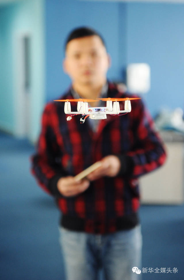 Flex创客团队队员在位于贵阳的办公室中操作他们的产品——3D打印制造的遥控飞机。新华社记者 刘续摄