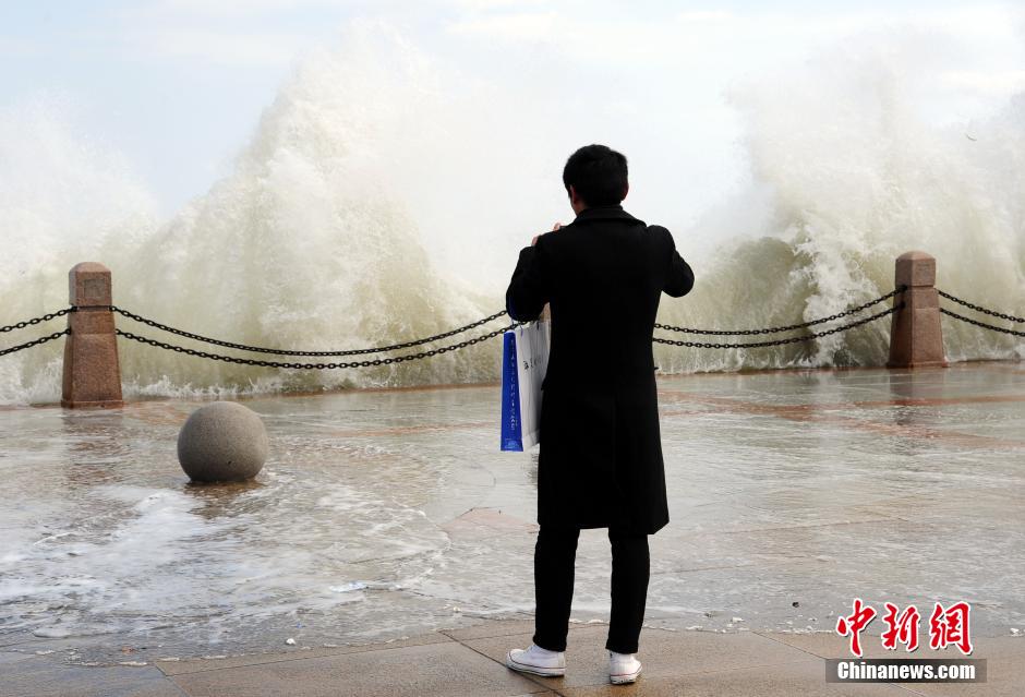 3月9日,山东烟台遭遇大风天气,市区滨海广场沿岸掀起了数米高的大浪,汹涌的巨浪后浪推着前浪接连扑向岸边,不时形成七、八米高的巨大“水幕”,十分壮观。不少摄影发烧友与游客见证了这一“巨浪拍岸”的景观。中新社发 王娇妮 摄