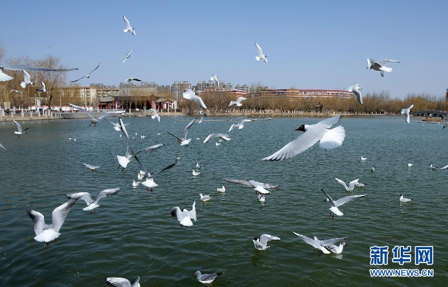 3月9日,在银川市燕鸽湖,众多红嘴鸥在水面飞翔。近日,随着宁夏银川市各湖泊、湿地冰面融化,银川市兴庆区燕鸽湖迎来数百只红嘴鸥在湖面飞翔觅食。近年来,银川市持续加大对湿地的保护与恢复,每年春季都有大批候鸟光顾,成为银川市一道美丽风景。新华社记者 王鹏 摄