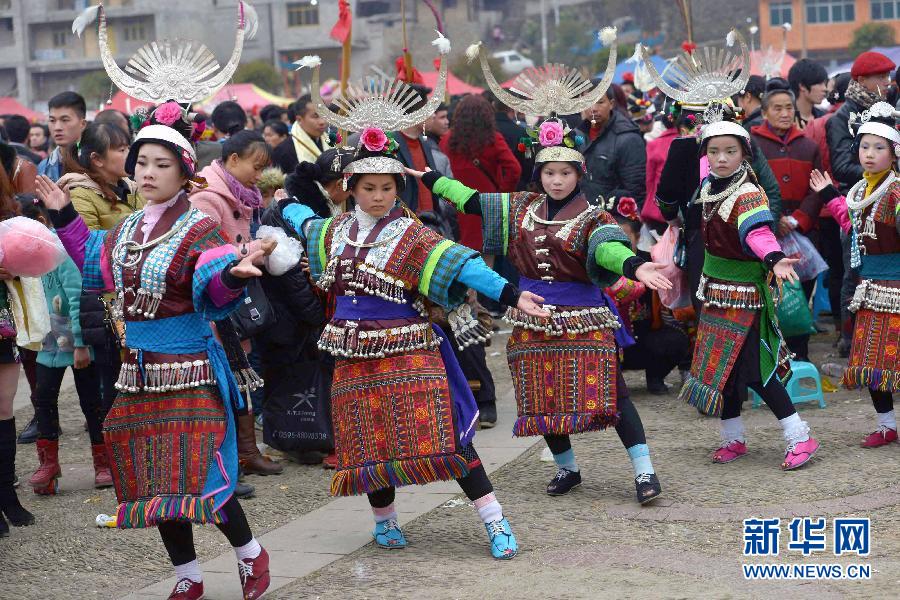 3月10日,苗族姑娘在贵州省凯里市舟溪镇甘囊香芦笙会上跳苗族舞蹈。