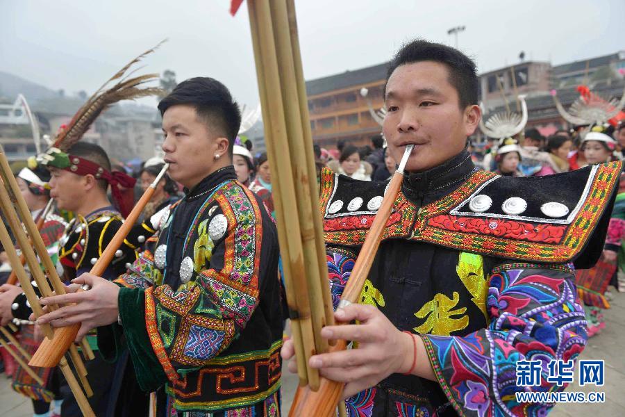 3月10日,苗族同胞在贵州省凯里市舟溪镇甘囊香芦笙会上吹奏芦笙。