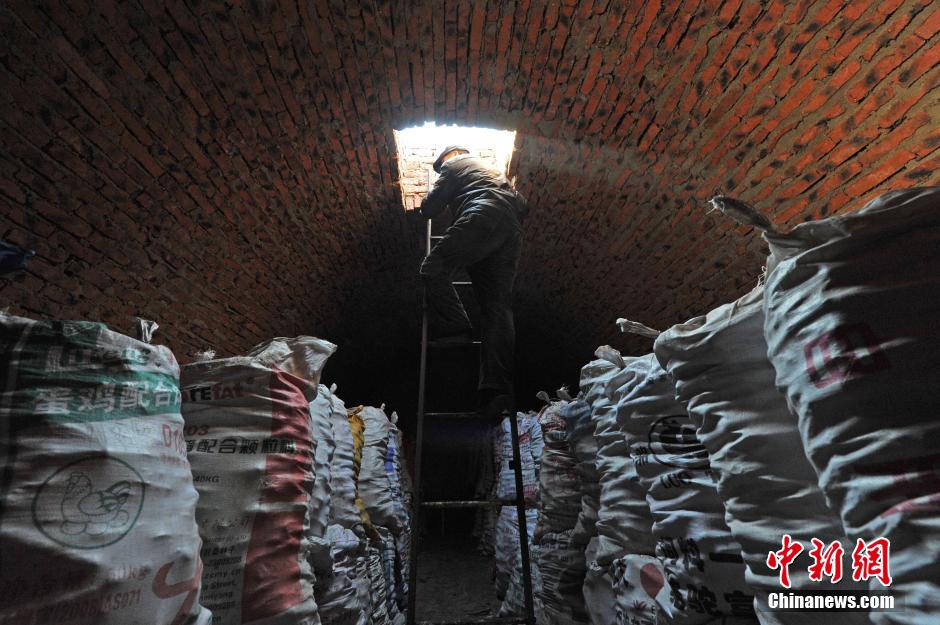 3月11日,辽宁省沈阳市沈北新区尹家乡新农村,村民苗书春家的地窖里堆满了成袋的胡萝卜。中新社发 孙昊声 摄