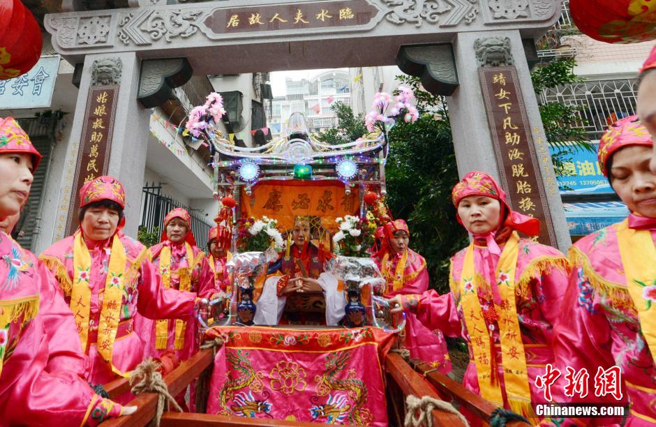 3月11日,“天下娘奶回娘家”活动在福州仓山区临水夫人陈靖姑故居举行。来自福建省南平、宁德、厦门、福州的26家宫庙的近百尊顺天圣母——陈靖姑金身在众多信众们护驾下“回娘家”。当日,1000多名顺天圣母信众来到陈靖姑故居,共同祈福国泰民安。陈靖姑是海内外公认的“顺天圣母”、“妇女儿童保护神”,福州人亲切地称她为“娘奶”,全球信众达8000余万。 中新社发 刘可耕 摄