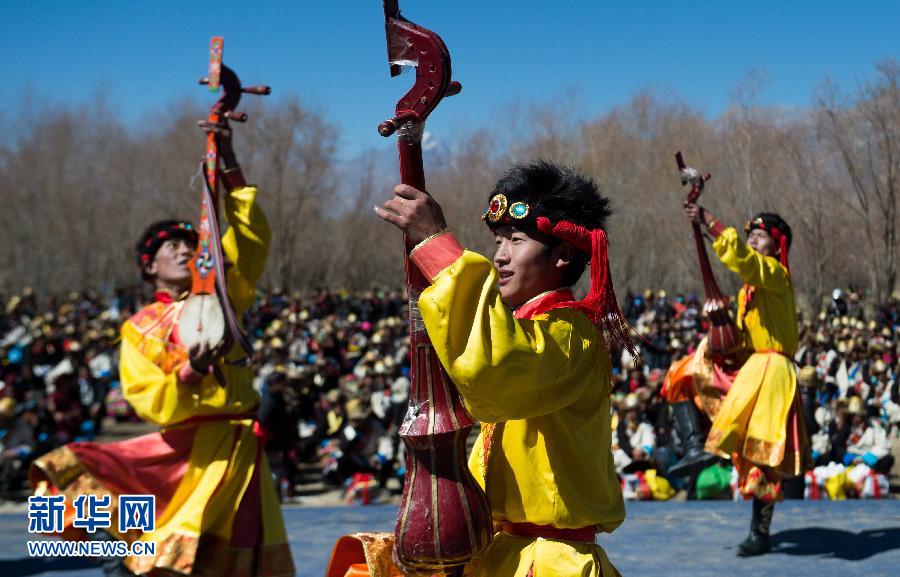 3月11日,文艺工作者在江塘乡举行的西藏“五下乡”活动中为农民表演节目。当日,西藏自治区2015年文化科技卫生法律和爱国爱教宣传服务“五下乡”活动启动仪式在山南地区贡嘎县江塘乡举行。 新华社记者 普布扎西摄