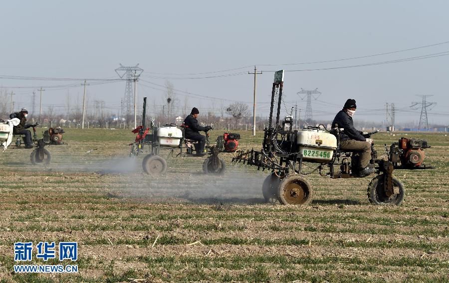 3月11日,在山东省桓台县唐山镇的麦田,农民操控自走式喷洒机为麦田进行春季病害防控施肥施药。随着天气转暖,山东省小麦主产区之一的桓台县35万亩小麦进入春季护理关键期。该县拨出专项资金,为全县麦农免费提供用于小麦防控纹枯病、根腐病和抵御倒春寒危害的药物和肥料。政府还出资向农机合作社购买农机服务,为适合机械化喷洒的麦田提供免费农机服务。预计3月底前,全县所有麦田都能完成春季病害防控施肥施药工作。新华社记者 徐速绘 摄